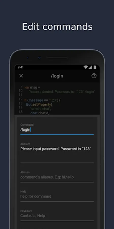 Command can have: name, help, aliases (second names), answer, keyboard, scenarios (for simple logic) and other options.