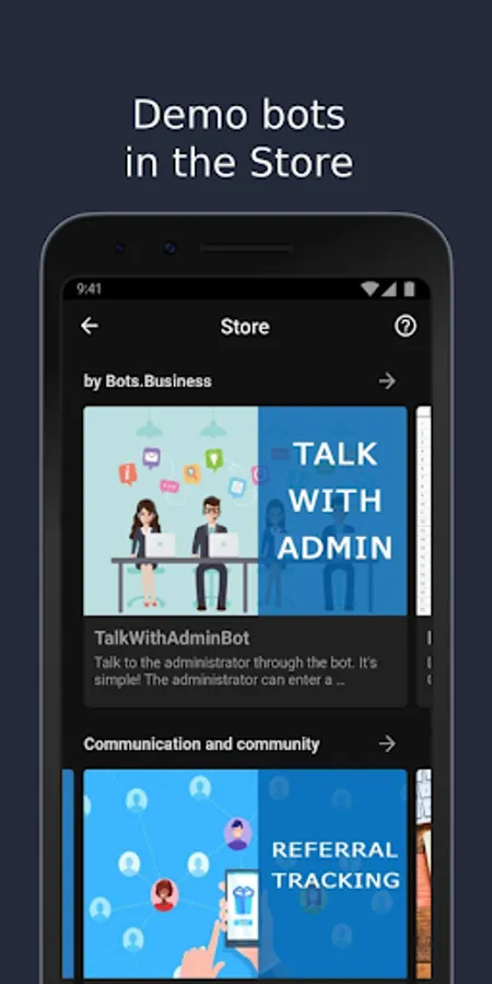 In the store are available various bots. Do you need referal tracking? Or chat with yours users via bot? This and the others are in the Bots Store!