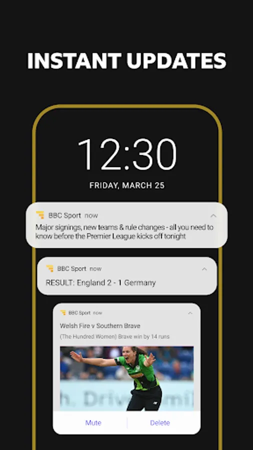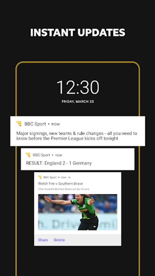 Receive personalised notifications that get delivered directly to your locked screen. Set notifications for top sports stories, plus more than 400 football teams, dozens of cricket and rugby teams and every Formula 1 race!