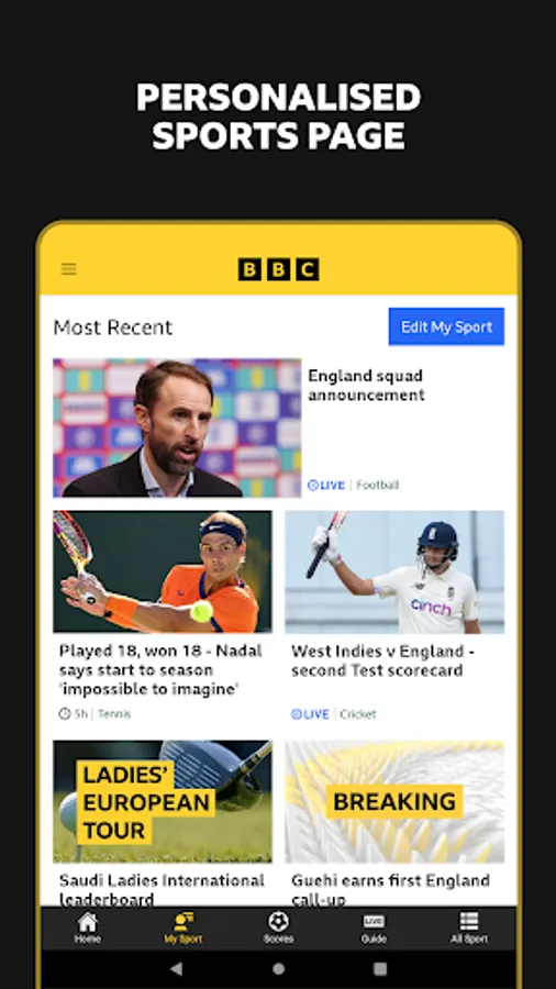 Create a personalised “My Sport” page to bring together the stories, results and fixtures for the sports you love. Choose from over 300 different topics to follow including your favourite team or sports.