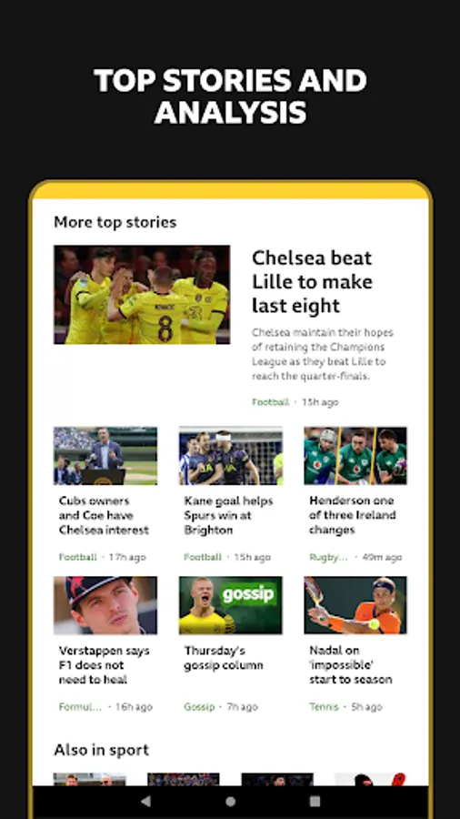 The BBC Sport app brings you all the breaking news across the world of sport including football, cricket, rugby union, rugby league, F1, tennis, golf, athletics and much more. Read all of the latest headlines, football gossip, transfer rumours and league action as the stories unfold. You can even share news stories and sports results with your friends and followers across your social channels.