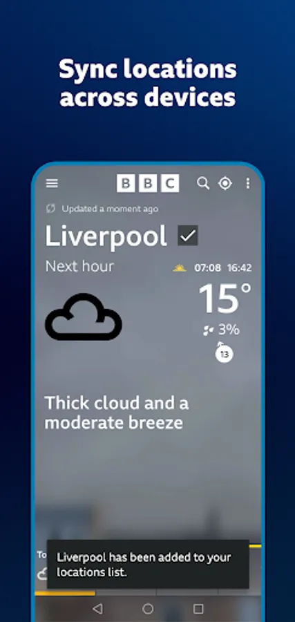 If you choose to enable this feature for the BBC Weather widget, we request permission to access your device’s location while the app is closed or not in use. This ensures that the widget can continuously display the most up-to-date forecast for your current location.