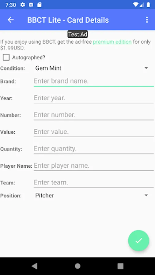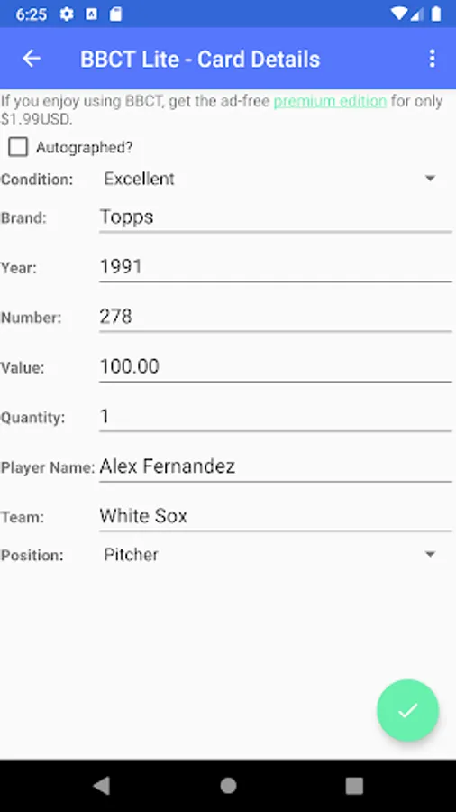 Baseball Card Tracker (BBCT) is a simple database app for your baseball card collection. You can add information about the cards in your collection, view details about individual cards, and filter the list of cards according to a limited set of criteria. BBCT helps you organize your collection and quickly look up which cards you own. Feel free to email your feedback and comments or visit the project website.