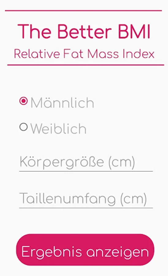 With this simple tool, you can measure your body based on the Relative Fat Mass Index (RFM). According to recent studies, this model is more suitable than the well-known Body Mass Index (BMI) in order to create an assessment about the physique of a person. You only need two valus: Your height and your waist scope. Those values fulfill the requirements of the Relative Fat Mass Index.