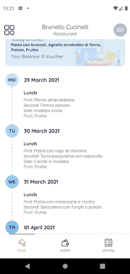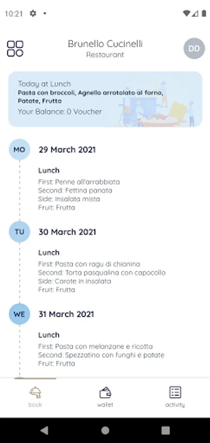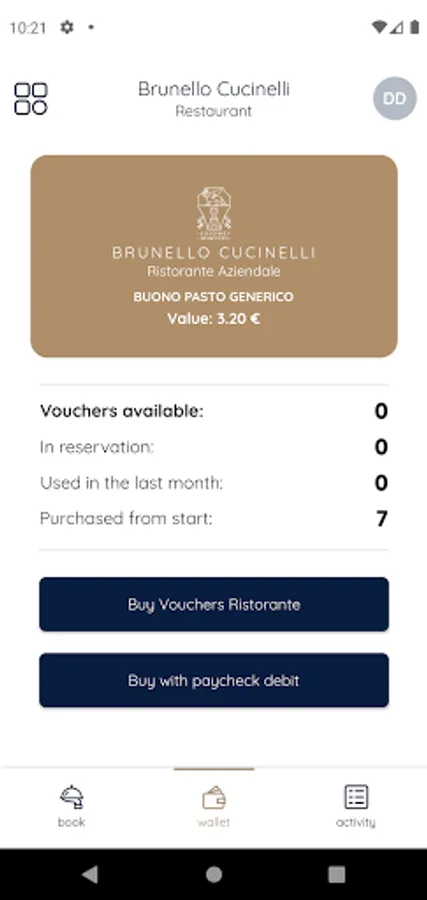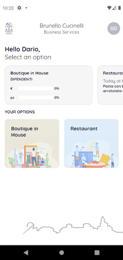 At the moment there is the possibility of booking / purchasing vouchers for the Corporate Restaurant of Solomeo, Parco dell'Industria and the booking and summary of access to the Internal Sales of Solomeo and Milan. However, the app is constantly evolving and will provide additional features in the future.