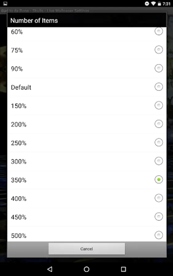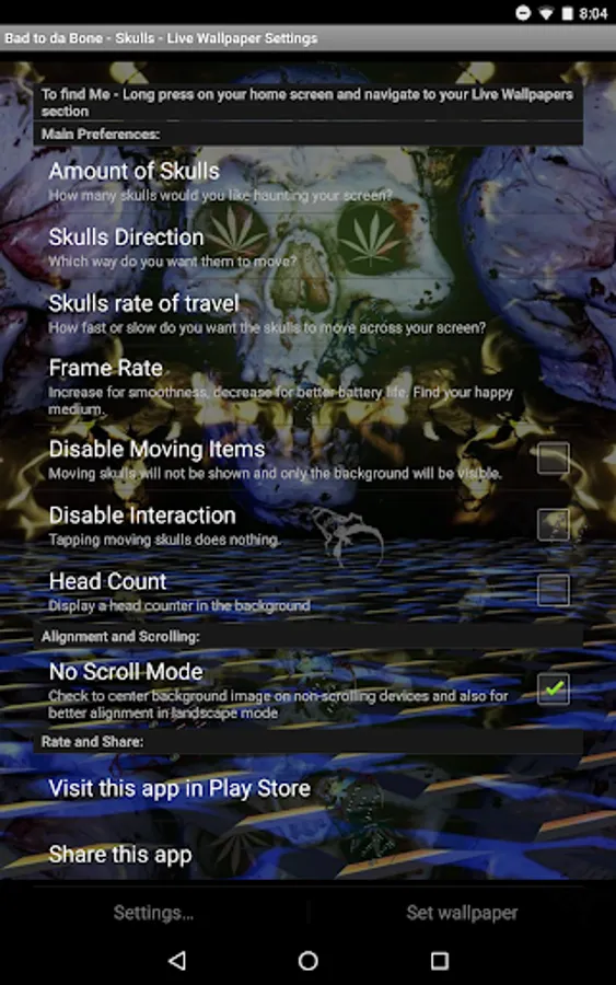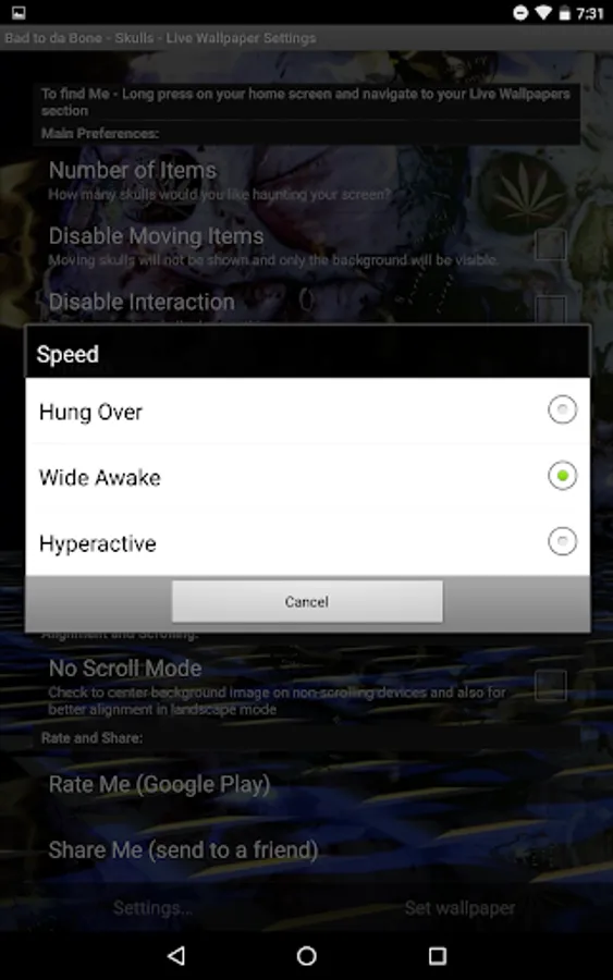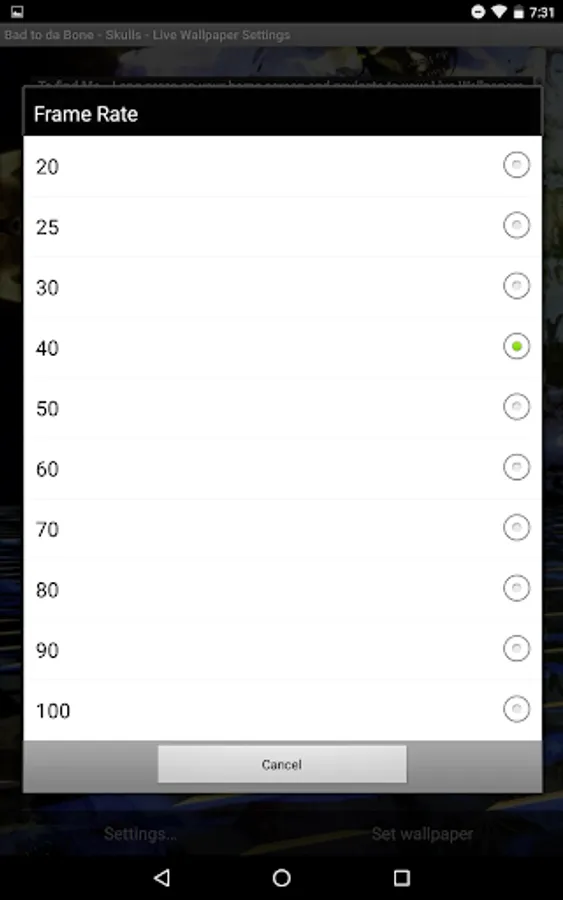 You have control over the frame rate and amount of items in the settings menu and should be careful not to lag out your system! A frame rate over 60 tends to slow the animations slightly on some devices tested, so user discretion is advised for best performance.
