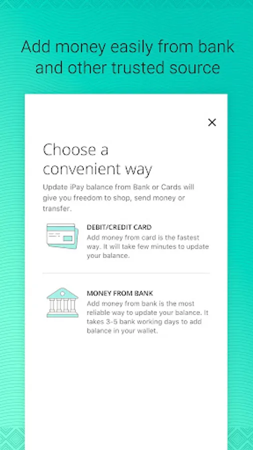 It gives you the freedom to open e-wallet using mobile number or email account. You can add money with your bank accounts by using Debit or Credit cards.