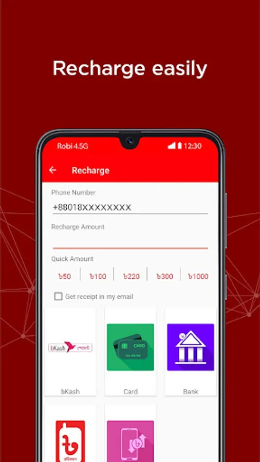 6. Quick recharge using bkash, Debit/Credit Cards, Bank Account or MFS.