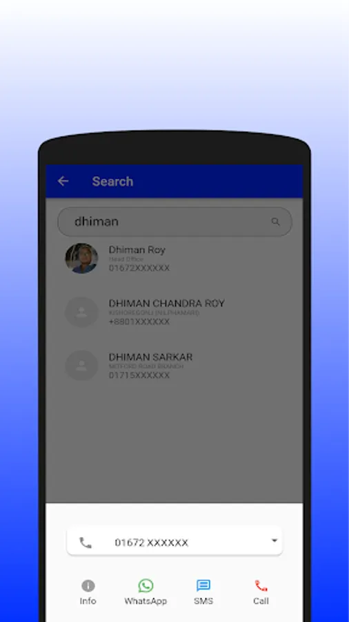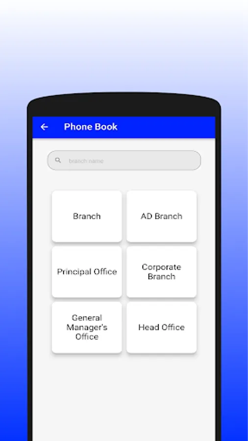 The application allows users to search for employees using various filters, such as name, designation, and branch location, making it easier for employees to locate their colleagues. The app provides the employee's contact information, including their phone number, email address, and office location, which can be useful for work-related communication.