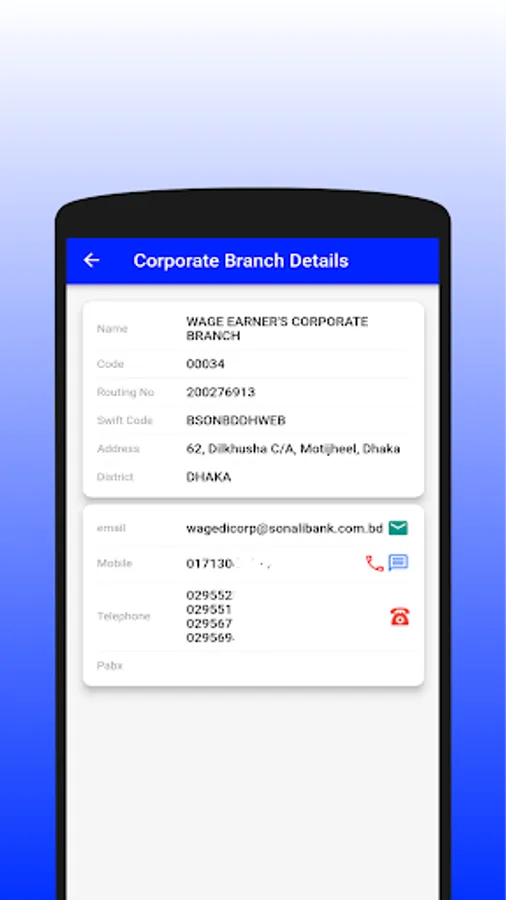 Additionally, the application allows users to view branch-specific information, such as the branch address, phone number, and manager's name. This information can be useful for employees who may need to communicate with other branches or coordinate with other team members.