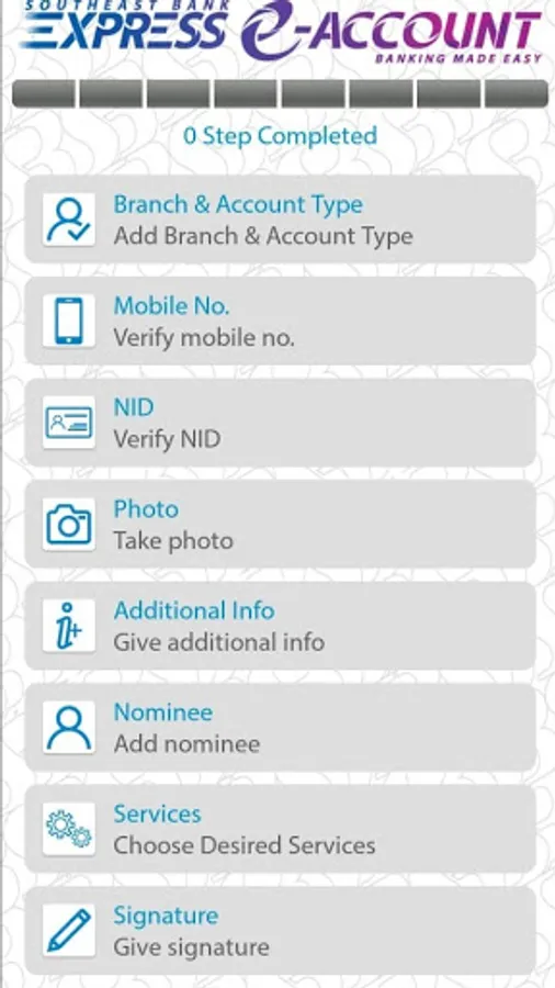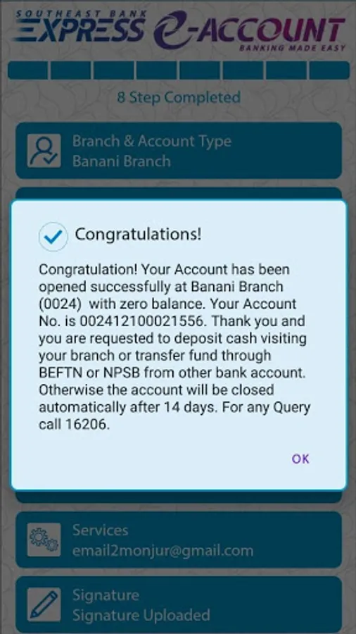 7. Initial deposit to new account either from any Branch or Uposhakha of Southeast Bank or from other bank account using BEFTN/NPSB.