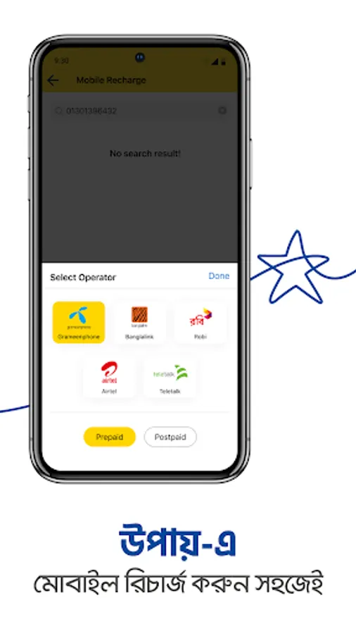 Recharge your mobile or any other number from all major operations in Bangladesh, including Grameenphone, Robi, Airtel, Banglalink and Teletalk. You can also find latest prepaid and postpaid recharge plans and best recharge based Internet, Voice and bundle offers only on upay app.
