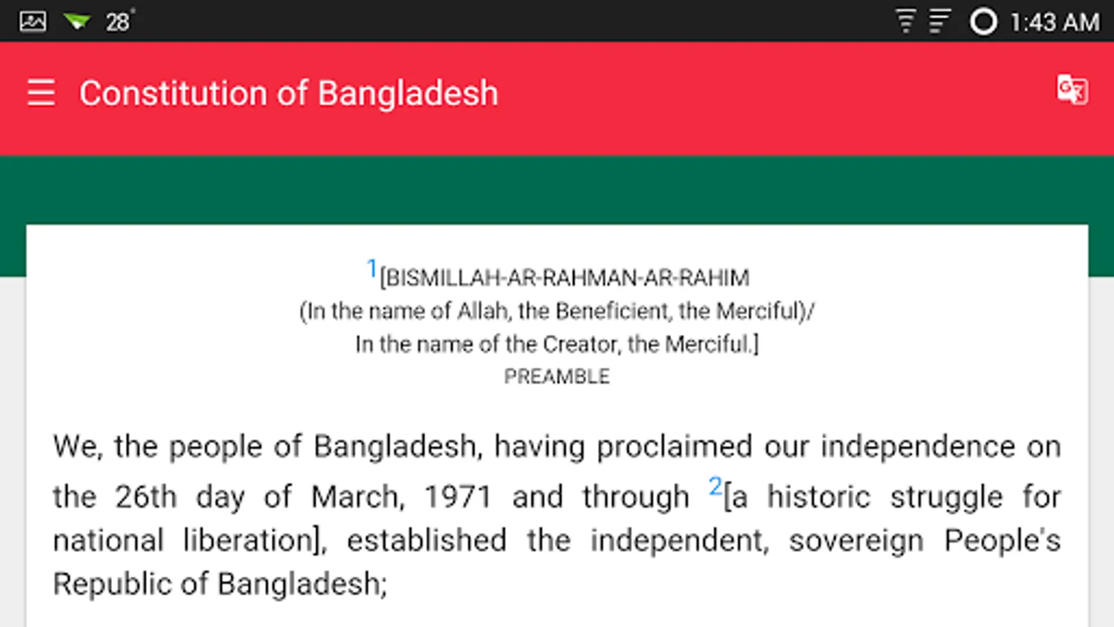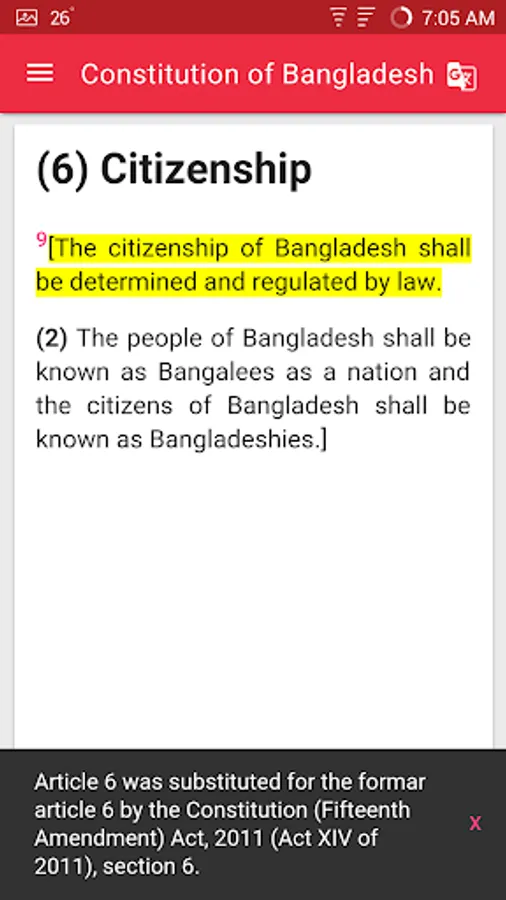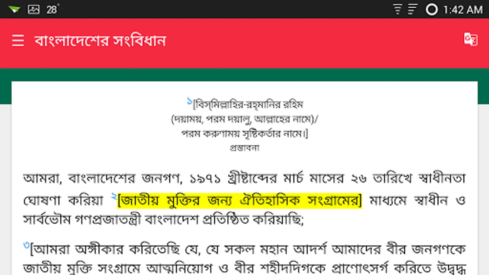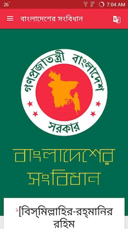 The Constitution of Bangladesh (Bengali: বাংলাদেশের সংবিধান Bangladesher Shongbidhan) is the supreme law of the People's Republic of Bangladesh. It was adopted on November 4, 1972. This is a digital version of the constitution for developed for android phone. This application has Bangla and English version of the constitution.