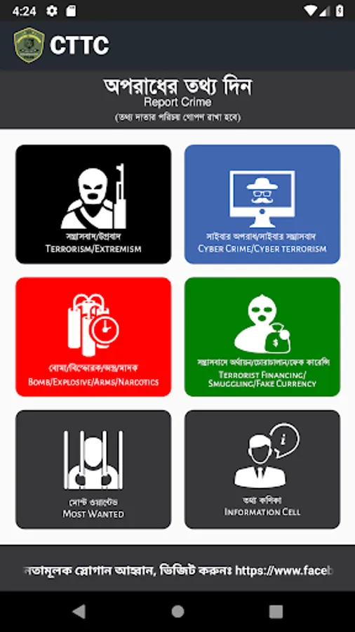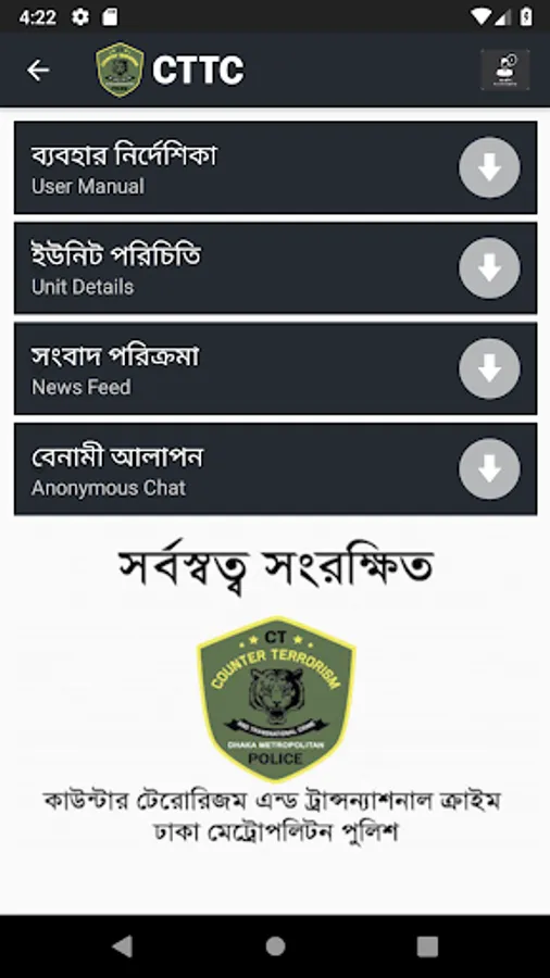 HelloCT App is introduced to encourage the citizens of Bangladesh to inform the Counter Terrorism & Transnational Crime Unit, Dhaka Metropolitan Police, Bangladesh Police about any information of terrorism, Extremism, Arms & Explosive, Cyber Crime, Drugs, Smuggling, Terrorist Financing and any other Transnational Crime