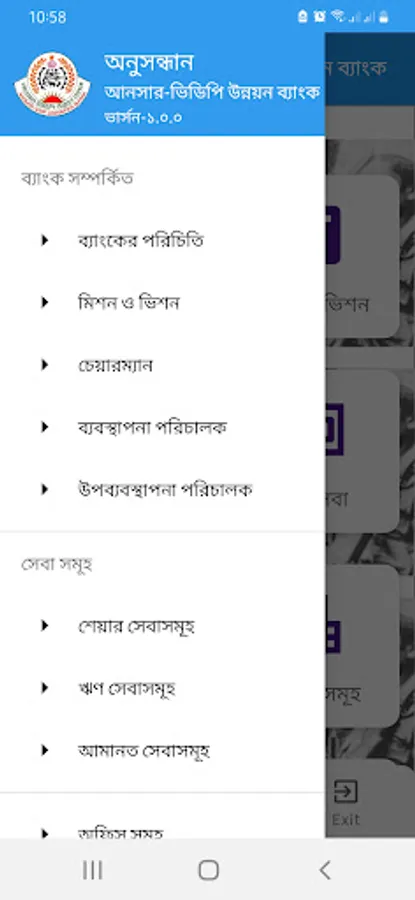 Ansar-VDP Unnayan Bank is one of the specialized banks of Bangladesh Government. This bank provides services to the members of Ansar and VDP. This app provides the basic information of this bank. It also provides share information, loan products and deposit products related essential information that the Ansar and VDP needs. They can now get information from anywhere with the help of this app.