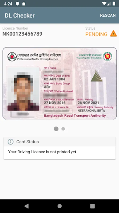 · The app has provision for an automatic scan of a barcode embedded at the top of the card [back side]. Once the scan is successful the app will display the latest status immediately
