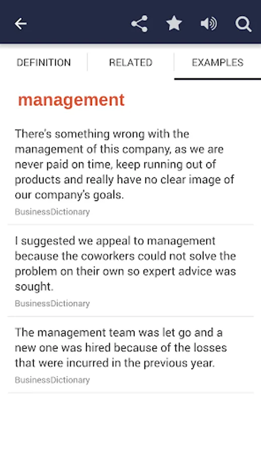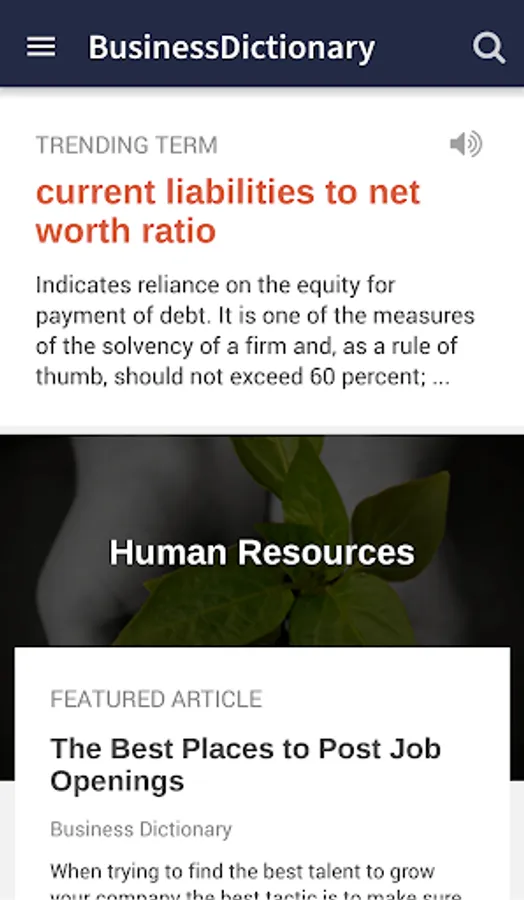 BusinessDictionary is a free easy-to-use FREE business glossary with over 30,000 definitions that span across critical business-related topics including entrepreneurship, management, small business, economics, human resources, recruiting, and corporate strategy. It's concise, clear, and comprehensive.