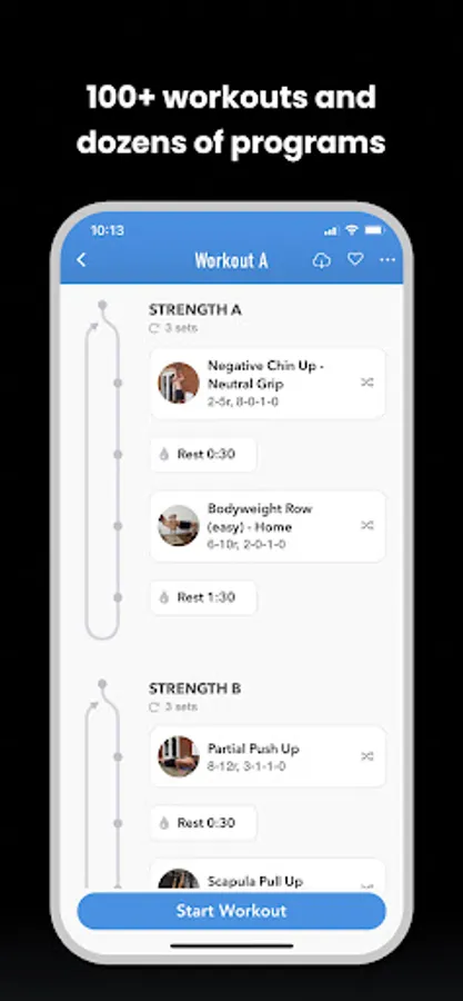 • Dozens of programs and 100+ workouts to help you build bodyweight strength, skills, and flexibility.