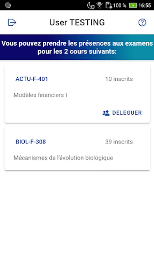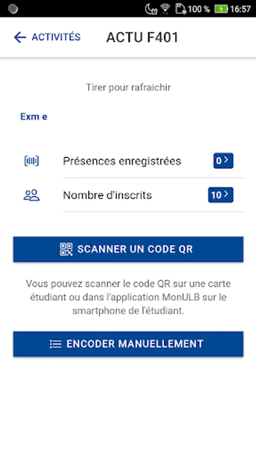 This application allows teachers at the Université libre de Bruxelles as well as authorized persons to register attendance for their courses using the QR code on the student card or the QR code in the MonULB mobile application. It is also possible for teachers to delegate the encoding of attendance to any member of the university community.
