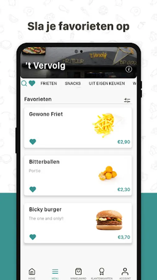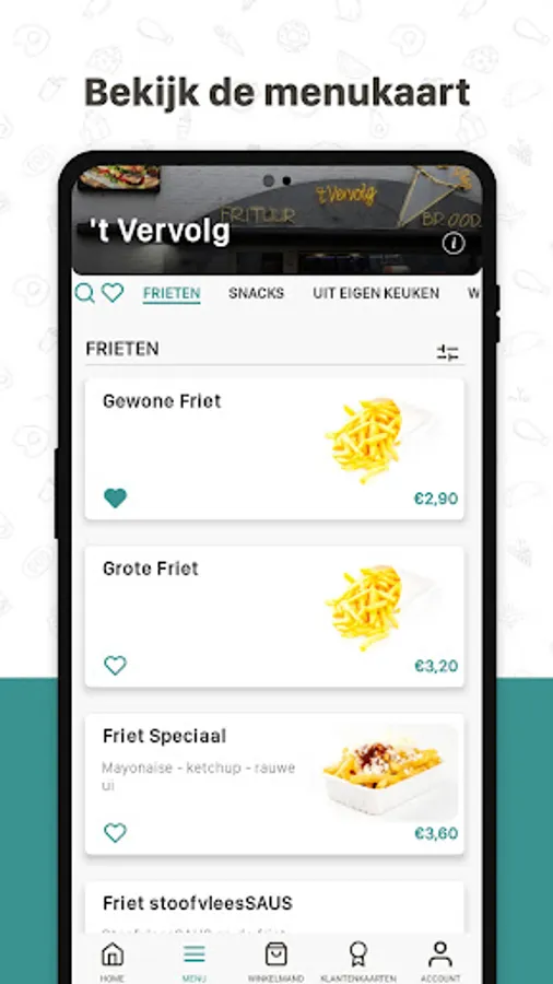 Een heerlijk pak friet, lekkere burger of smakelijk broodje zonder lange wachtrij? Download de app van frituur ‘t Vervolg en bestel online.