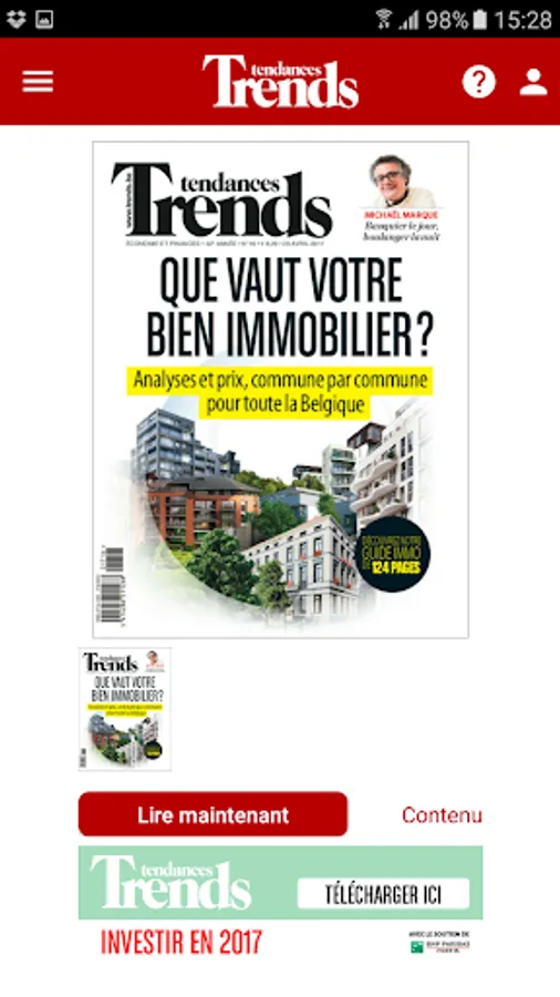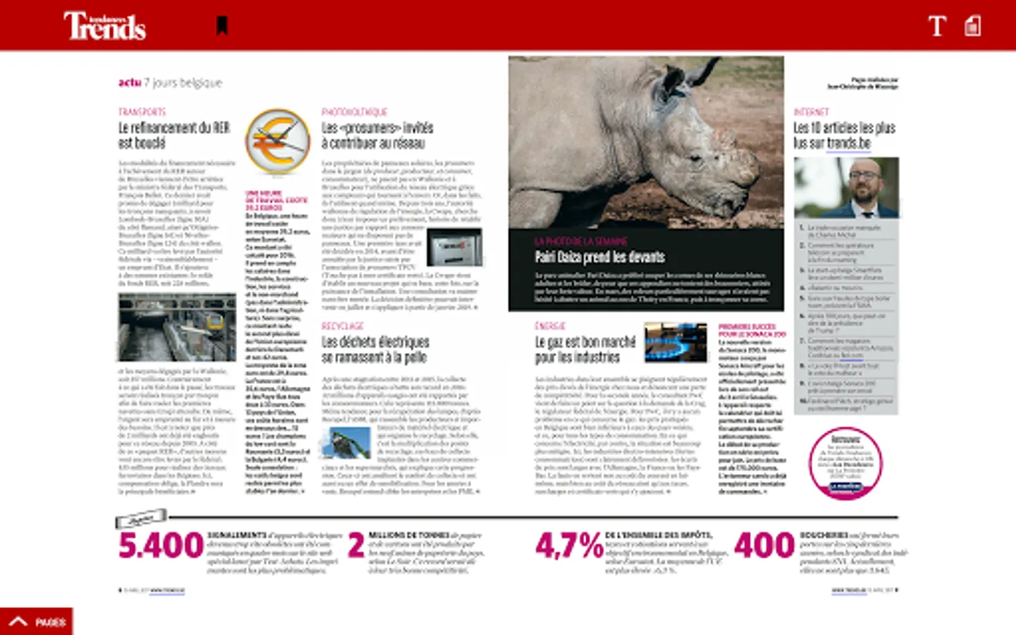 The smartphone and tablet reading of the magazines Trends-Tendances is free for the subscribers of the paper version. You only need to activate this service by using the app or via a registration on the Tendances.be website.