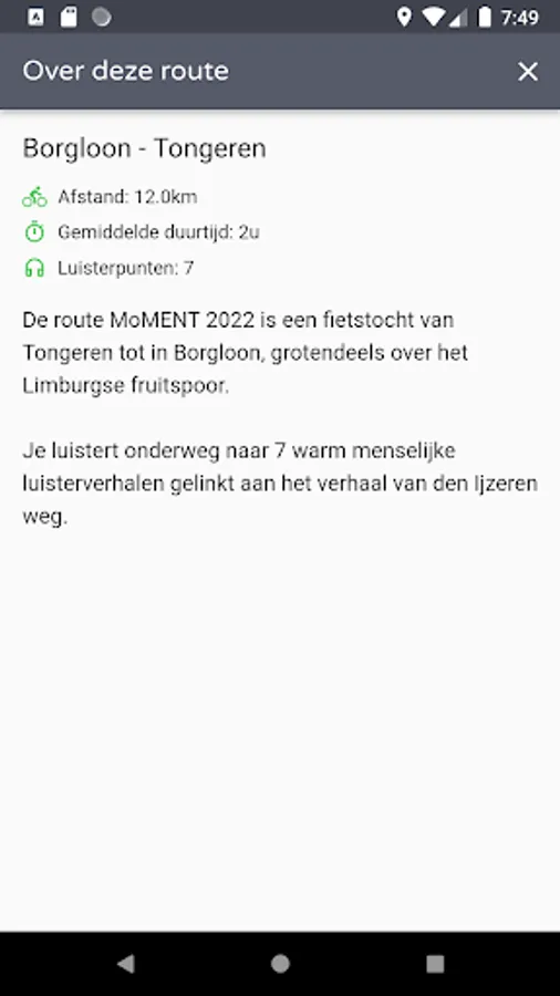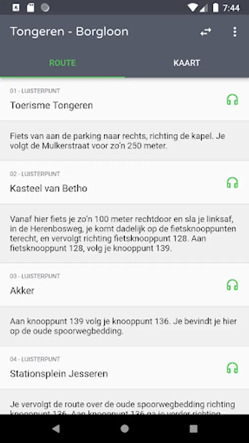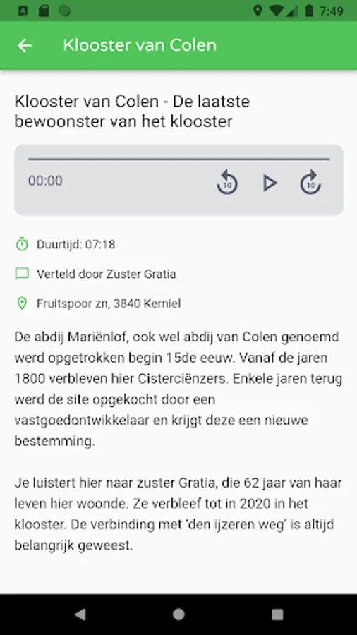 The app contains a cycling route on the historic Fruitspoor that stretches from Tienen to Tongeren. Along this cycling route you will listen to striking stories linked to this 'iron road'. You will also find detailed walks in the vicinity of this old railway, where you always get new stories, including about the Battle of Landen, the glorious past of the syrup factory in Borgloon, the legends at the Vinne in Zoutleeuw