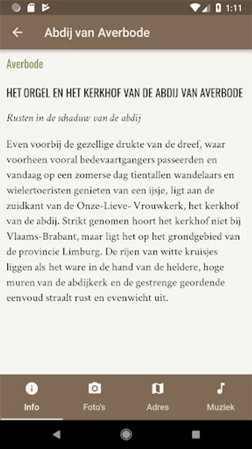 The app is a sequel published in 2018, the in June 2016 by the Kerkfabriek St. Anthony Abbot Wolfsdonk and Crown at Work published book "Along churches, cemeteries and organs between Leuven and Averbode. The app provides background information, images and sound in each of the churches, cemeteries and organs and a route that can be followed through cycling. A day out with the bike gives you insight into the stories that characterize our country