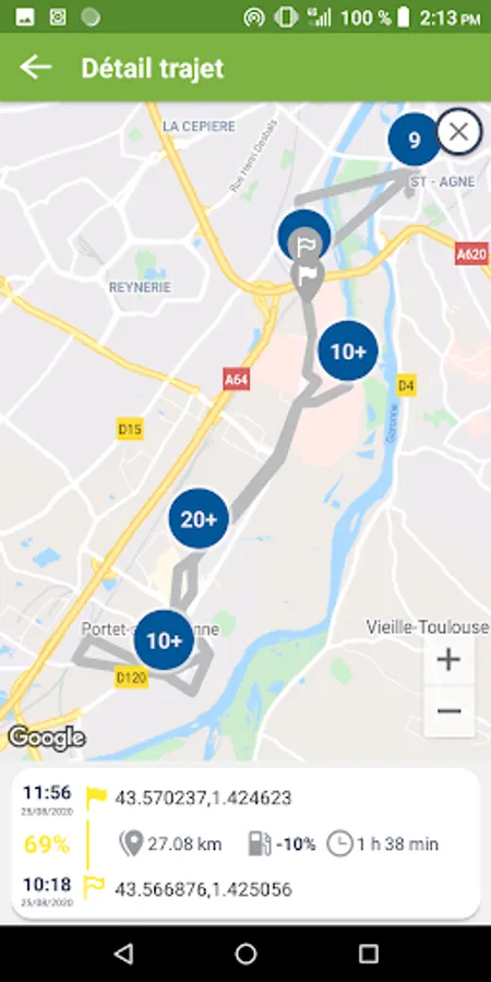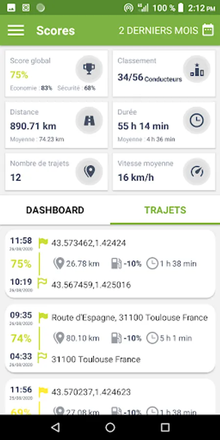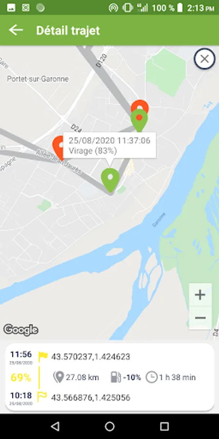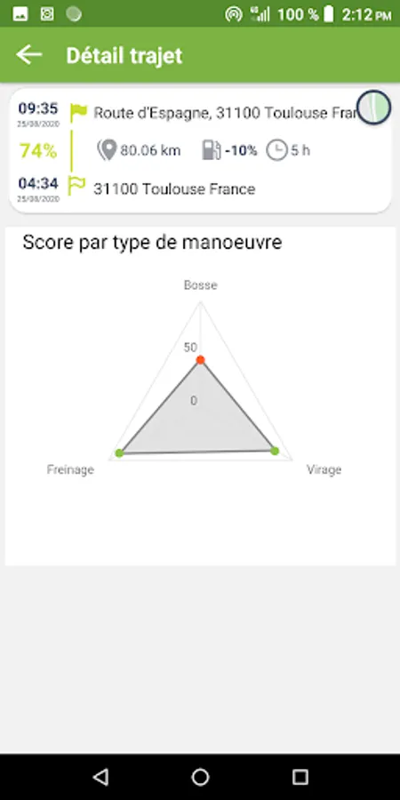 - Visualization on the map of driving events occurring during the trip, and influencing the score: braking, acceleration, turns, speeding, etc.