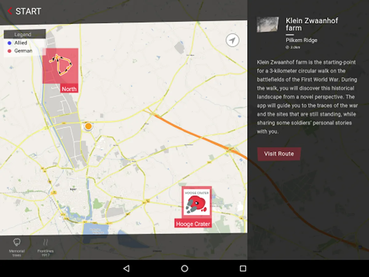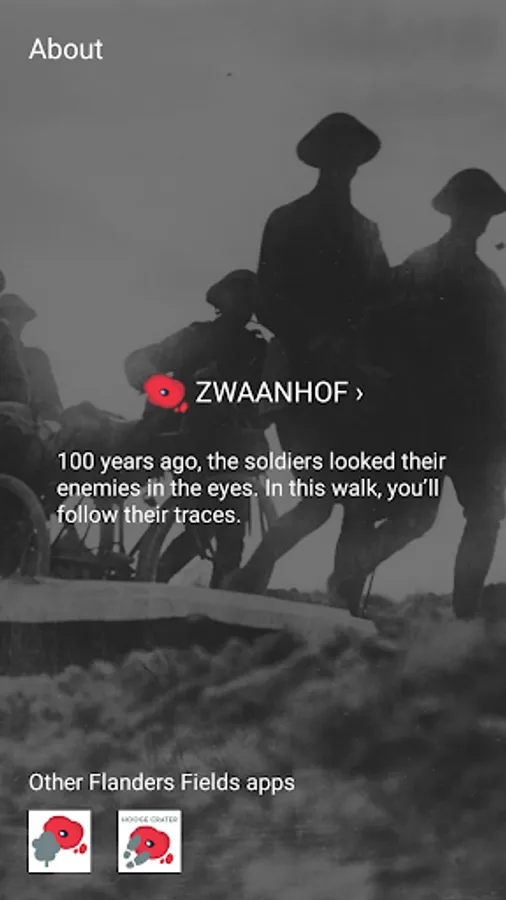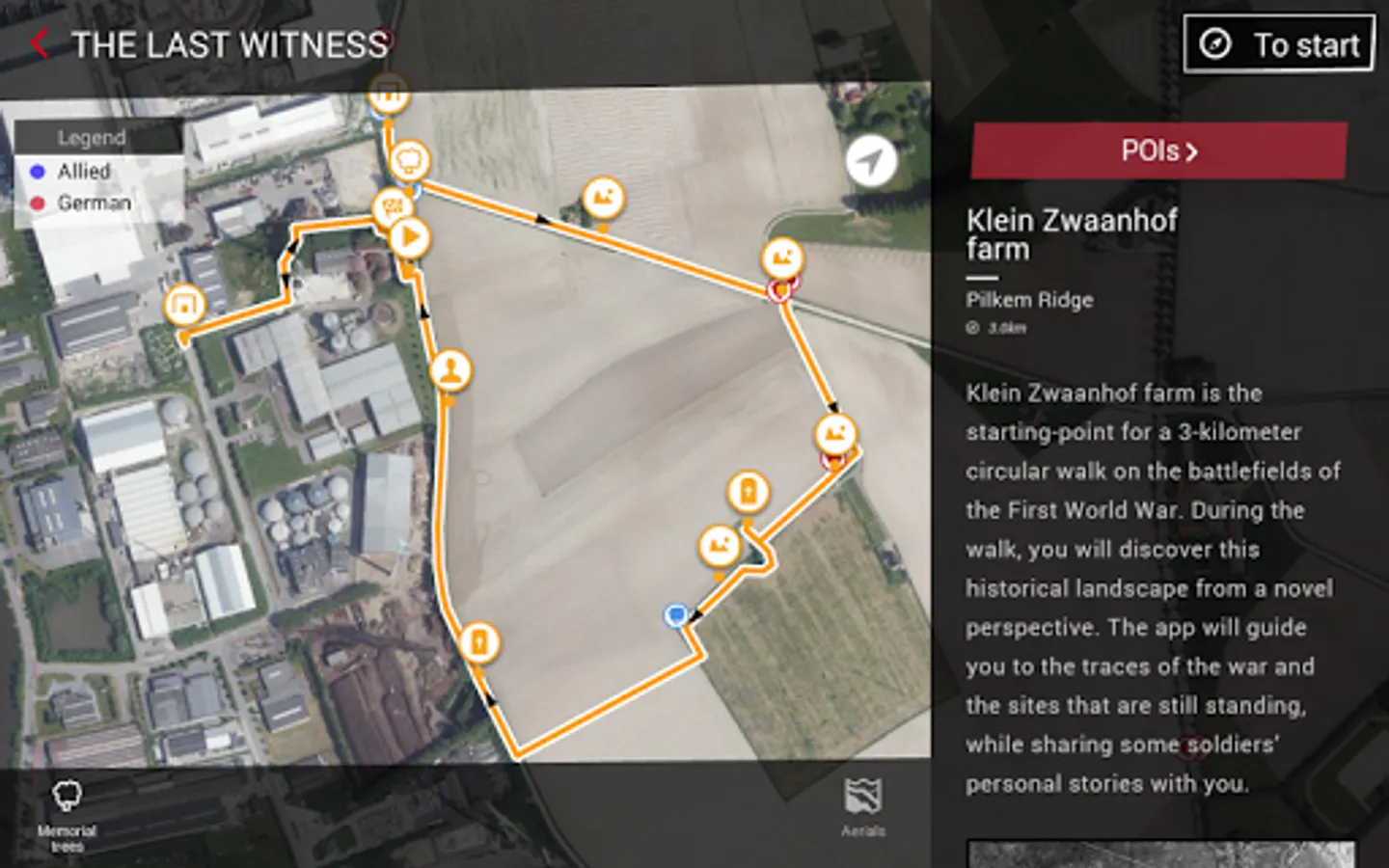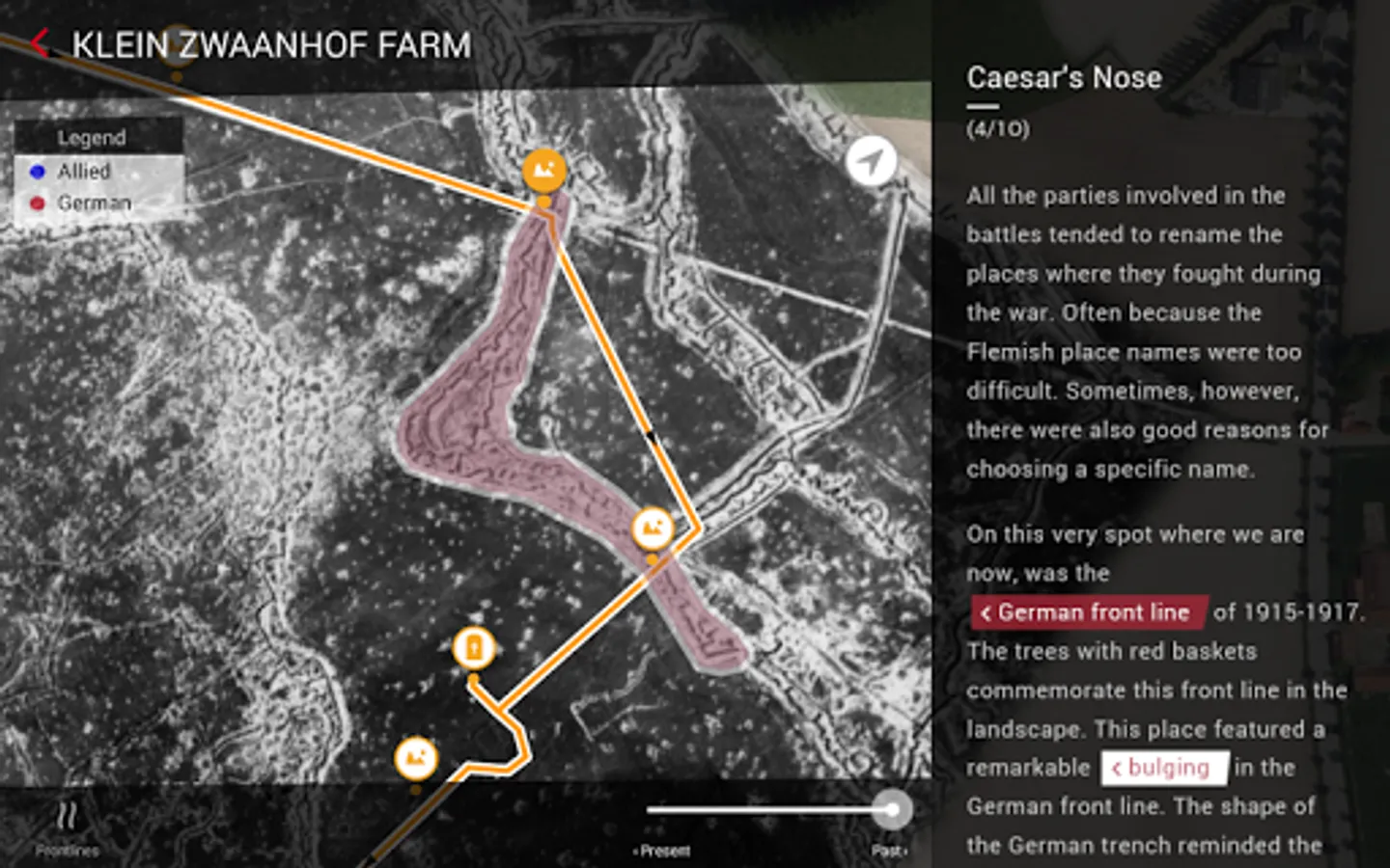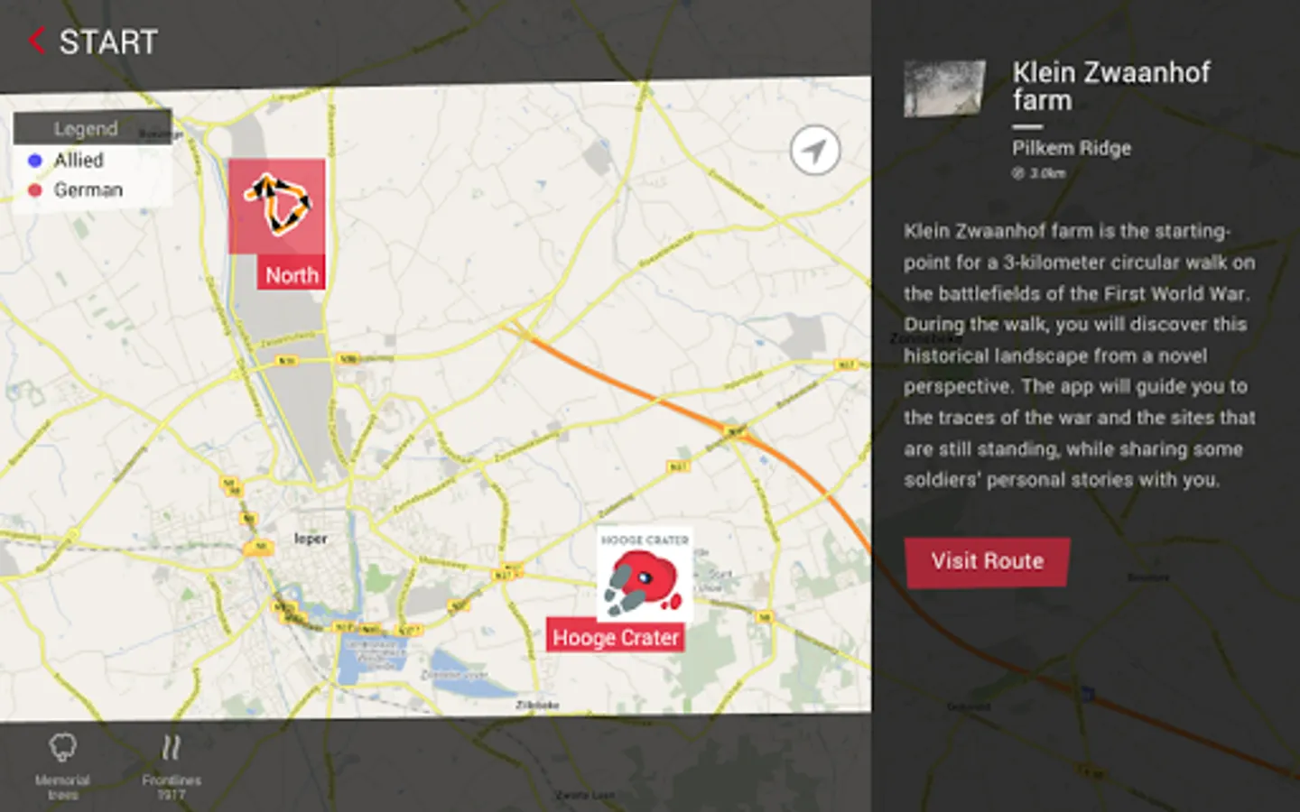 This app helps you explore the war landscape around Ypres. It will immerse you into the First World War and help you unveil the vestiges of battle and the historic sites. More exciting still, the app allows you to virtually walk on top of the front line trenches. So that you experience how incredibly close the front lines were to one other and how dense the trench network was.