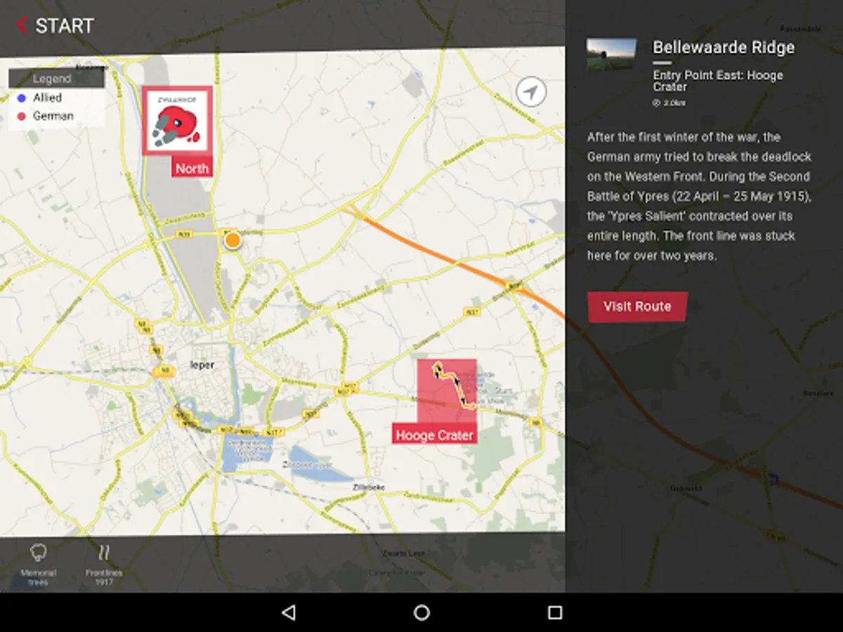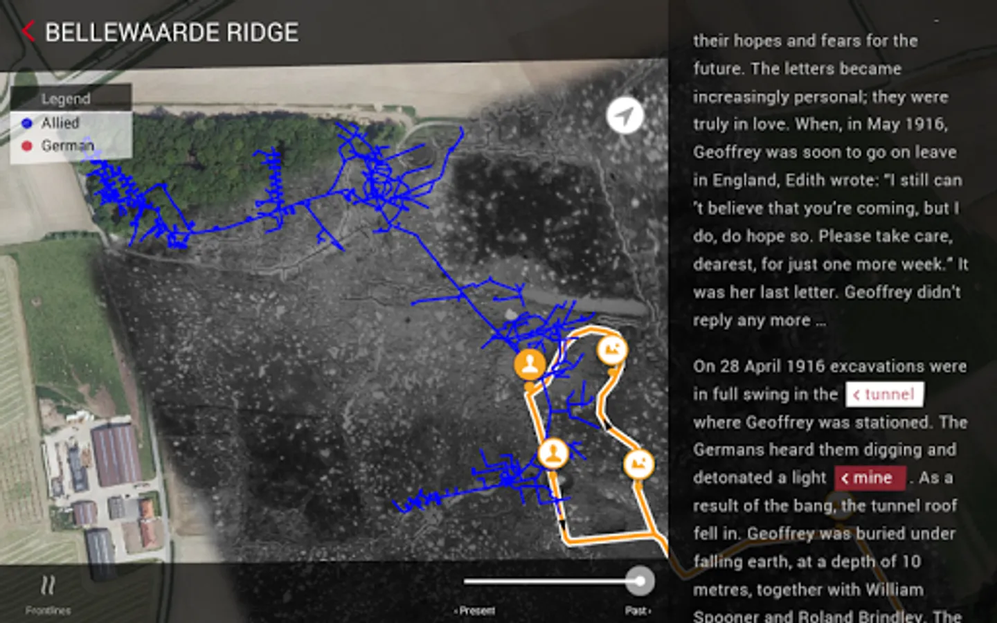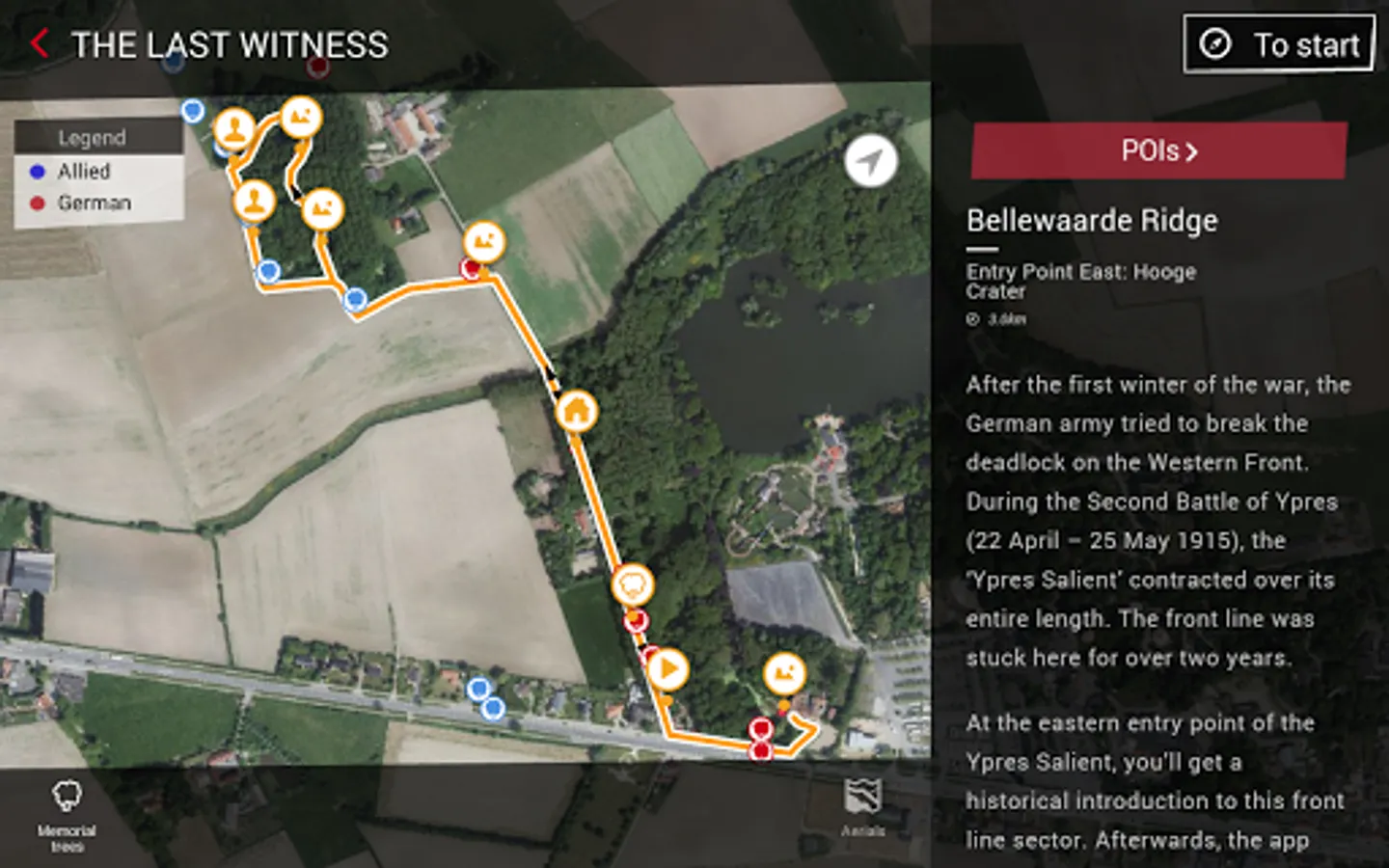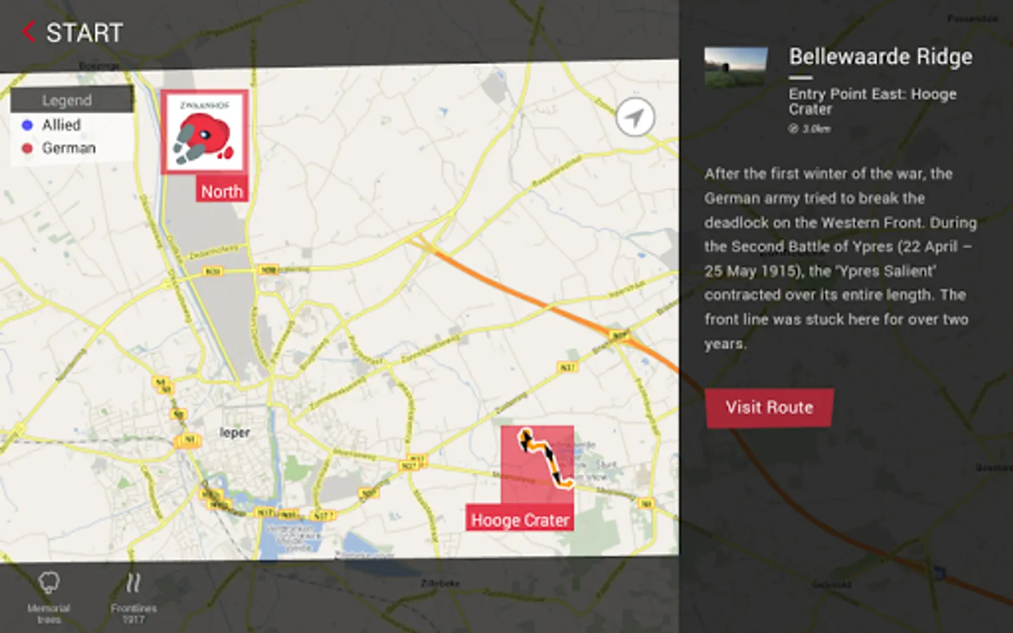This app helps you explore the war landscape around Ypres. It will immerse you into the First World War and help you unveil the vestiges of battle and the historic sites. More exciting still, the app allows you to virtually walk on top of the front line trenches. So that you experience how incredibly close the front lines were to one other and how dense the trench network was.