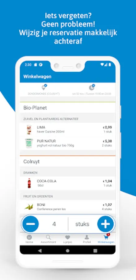 Compile your shopping list from the Colruyt and Bio-Planet range. You can pick up at more than 200 collection points. Moreover, you only have to pay for your reservation upon collection.