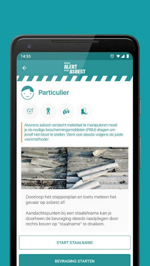 Even though the risks of asbestos exposure are identical, the legislation makes a distinction between asbestos applications in private and professional contexts. Different procedures have to be applied. The app can be used for both situations.