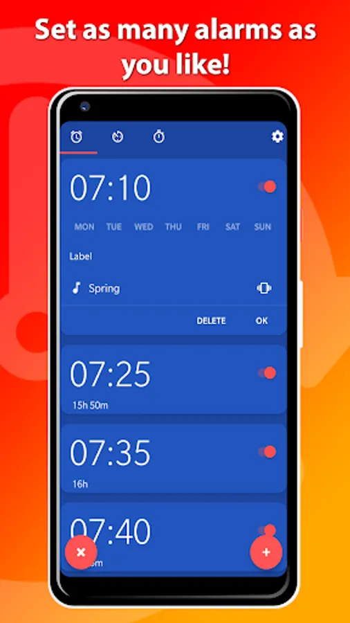 With this smart alarm app called OneClock, you can set multiple alarms with just one click! You can also delete all alarms at once with the delete button below.
