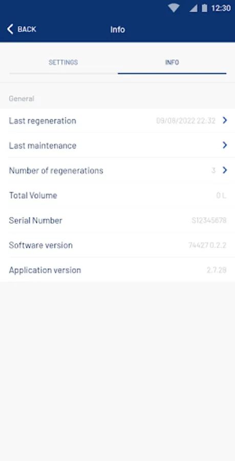 Look up general information about your products, like the serial number, total volume and software version, and check your appliances’ regeneration and maintenance history.