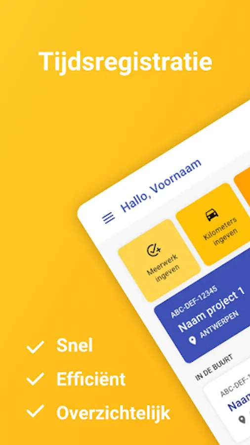 Using the app, you can log in and out on a project or external location with a single push of a button. Hours are registered automatically. The app uses location determination, which means that there is control over the attendance or absence and over the arrival and departure times. Additional work performed on the site/project can easily be entered accompanied with text and photos. Per project you can provide information to the employees: addresses, job descriptions, contact details and telephone numbers of customer/architect/…. Employees can add travel distances and absences (leave, illness, schoolings, etc.). Hence, this tool facilitates the follow-up of projects, payroll administration and even invoicing and subsequent calculation. All data can be exported to Excel.