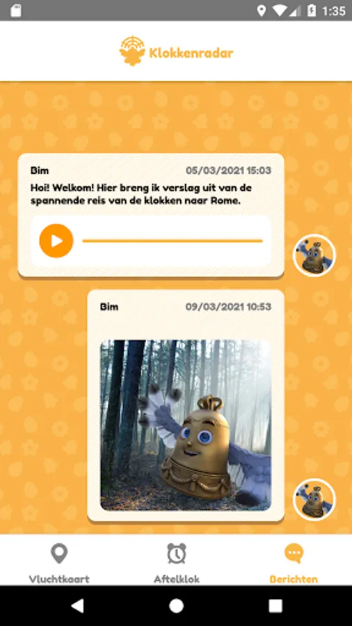 Together with clock Bim you follow the adventure of five bells live: Bim's parents Patina and Tuur, Apollo - the bell from the fire station that rings the alarm when it burns somewhere -, captain Remi and Aurore. They make the long way to Italy to collect crystal eggs from the sanctuary for Saturday evening, to celebrate spring. Bim himself is still too young to fly, but from his own tower he reports on the journey that the others make, through wind and weather.