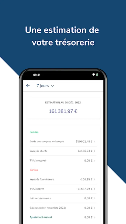 • Based on your planned inflows and outflows, MonComptable app estimates the state of your cash flow at 7 days, 14 days or the end of the month;
