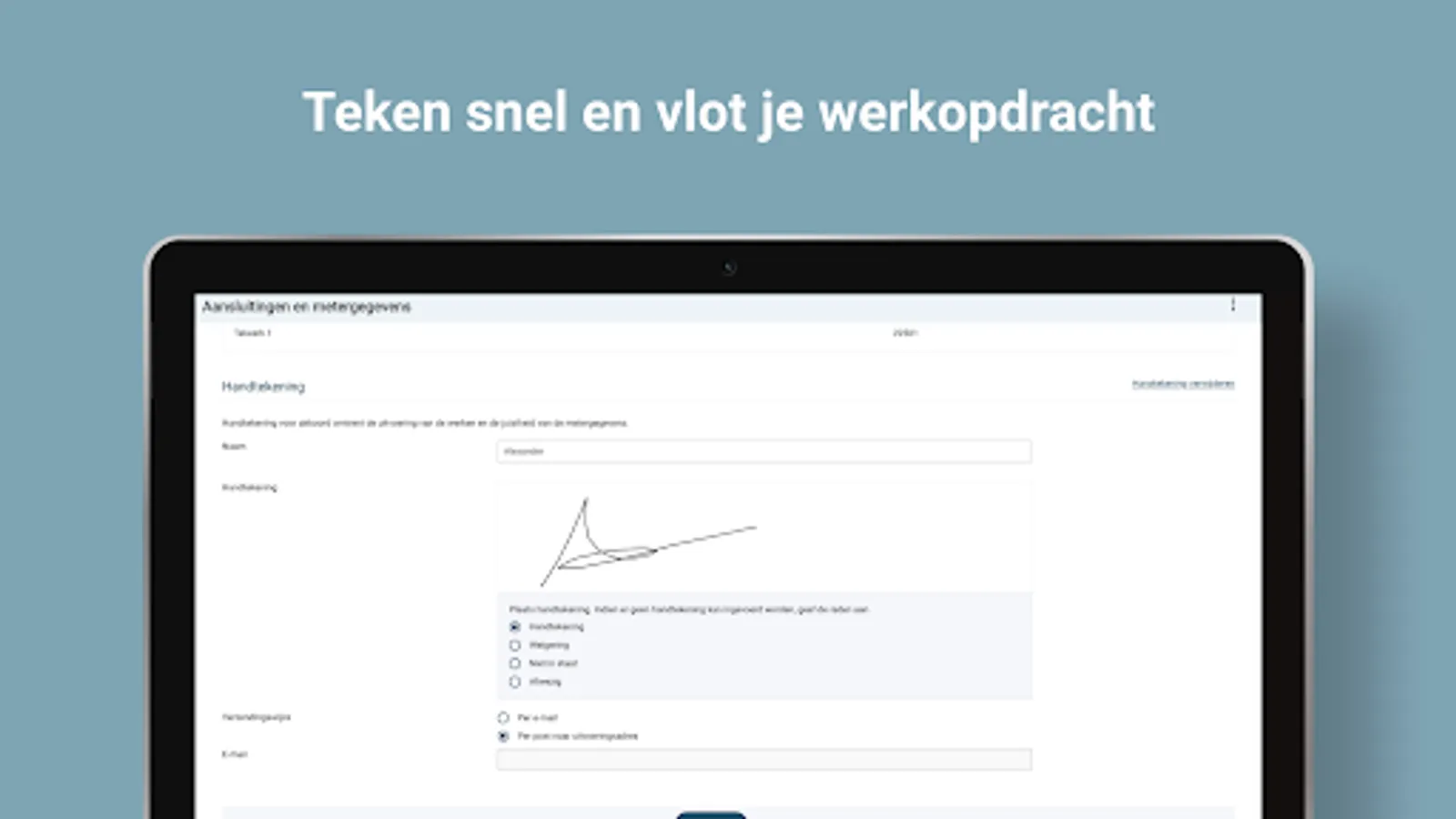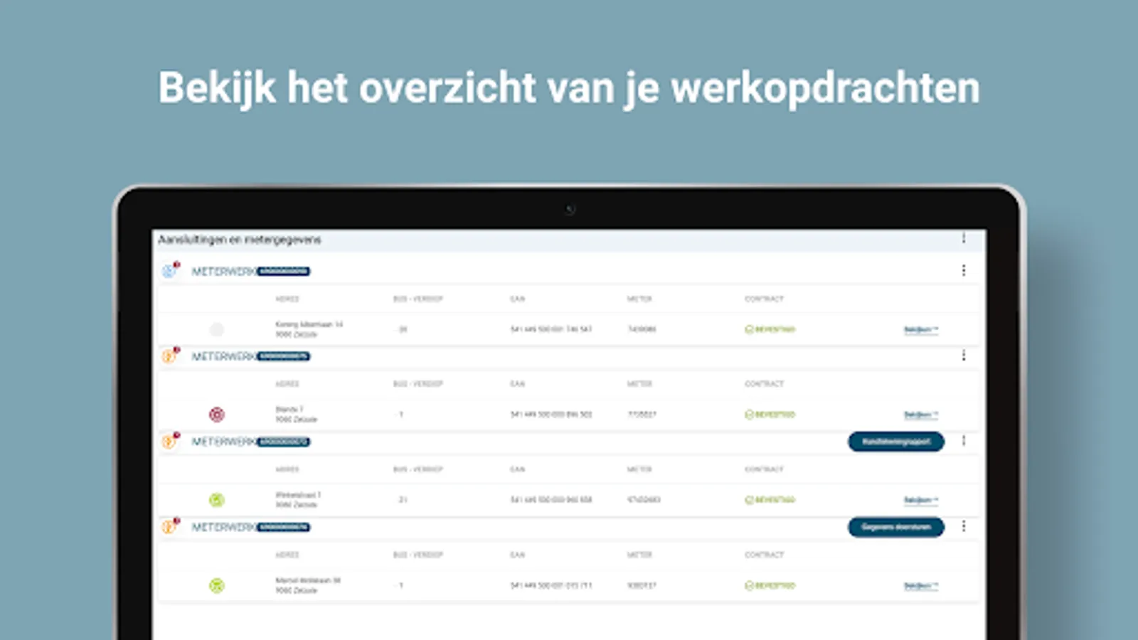 Download the MADA app from Fluvius here! With this app you can consult and/or change the meter and connection data of an installation with a few clicks. In this way you can register in an intuitive way that you have, for example, replaced a meter, put it out of service or removed it. Once installed on your device, it is sufficient to click through to the MADA from your execution application. This will then be opened with the data of the work order you are working on. This app is accessible to both internal and external employees.