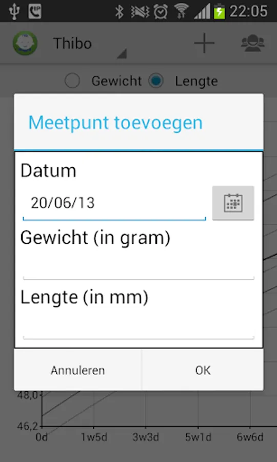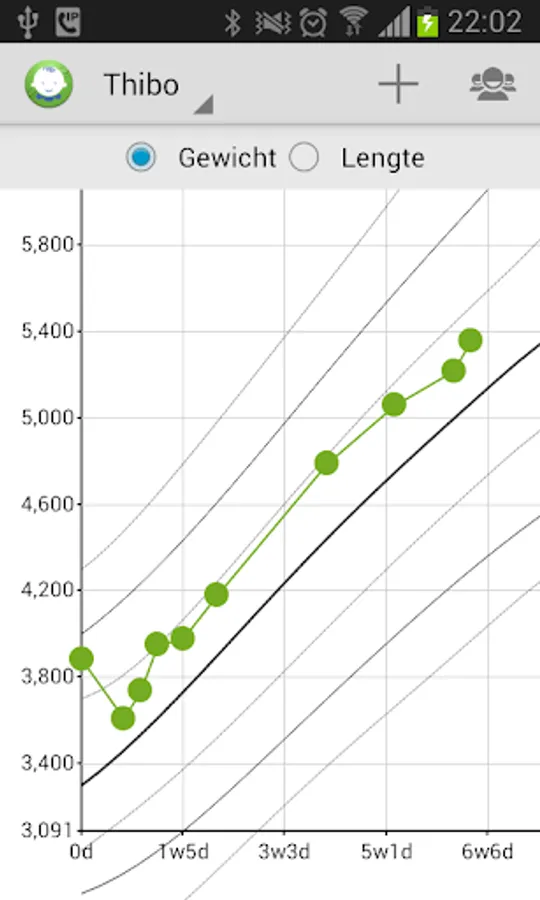 You can add multiple kids. For each of them, you can specify data points (length, weight and head circumference) in a simple manner. These points will be drawn on a graph, on which you will also see reference data, coming from the World Health Organisation.