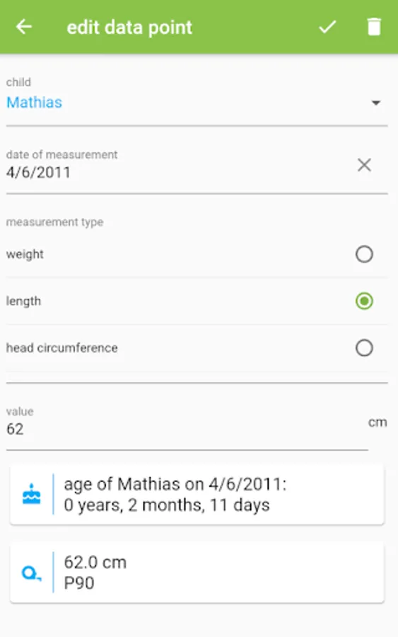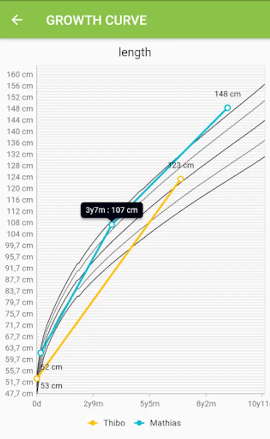 Multiple children can be added, and for each of them, measurement points (length, weight en head circumference) can be added. These will be shown on a chart, on which you will also see the reference lines (percentiles). You can choose which percentiles you would like to see. This data is coming from the world health organisation (WHO).