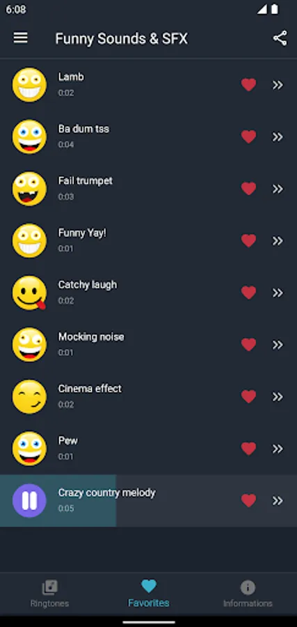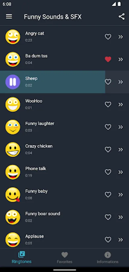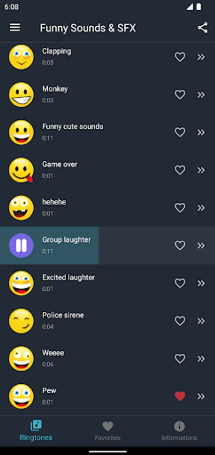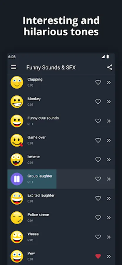 Our collection of funny sounds and ringtones will make you and laugh till your stomach hurts. We have carefully selected the most popular and funniest sound effects and put them in one free app. Funny jokes, cool sounds, annoying loud tones, movie sound effects and so much more. This app has a huge variety of tones, and it’s also really easy to use, just tap on button to play the sound, and if you like it, you can place it in Favorites list and create your own list of favorite funny ringtones and sounds. And if you want to have hilarious ringtone, click on options button and set it as ringtone, contact ringtone, alarm or sms or notification alert. Laugh every time your phone starts ringing. Play those cool sounds at any time, they are just a few taps away from you. Use your creativity and humor to play funny jokes with your friends.