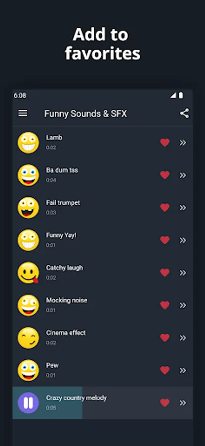 Have a good time and laugh with your friends with this free funny sound effects app. Funny Sounds & SFX app features over 40 funniest and most interesting sounds and sound effects that will make you laugh. Use your creativity, play these sounds at specific times to make your jokes or situations funnier and make everyone around you laugh.