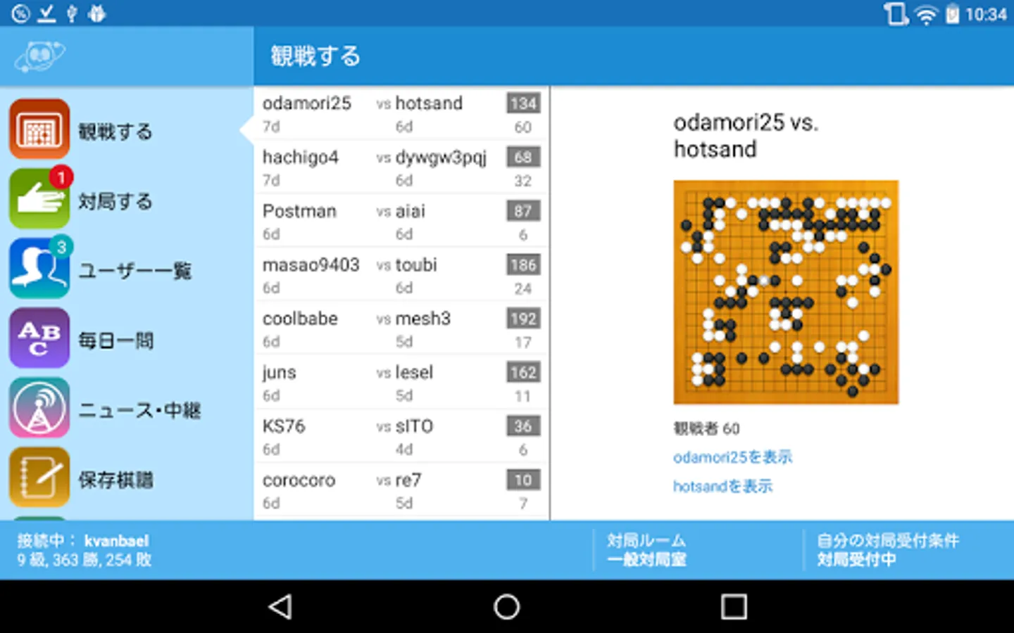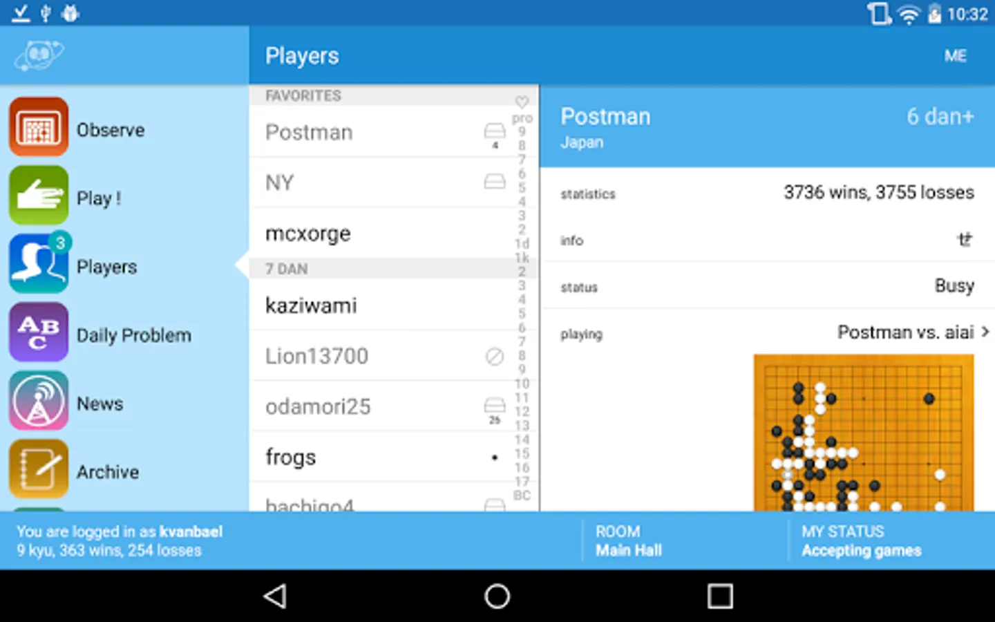 This feature allows you to display a list of users currently in rooms, invite others to a match, and to view matches in real time. At least 1,000 members are logged in at all times, allowing you to play or view Go matches 24 hours a day, every day of the year. A perfect way to wile the time during commutes to work or school. Plus a reliable, patented rating system allows you to match up with anyone, regardless of skill differences, under the appropriate handicaps to even out the playing field.