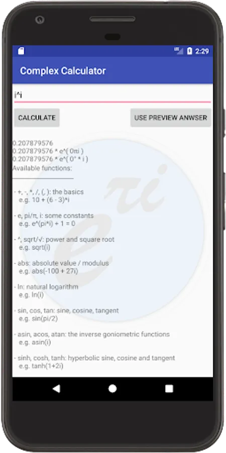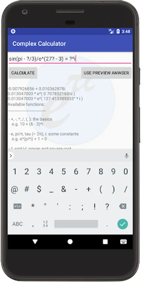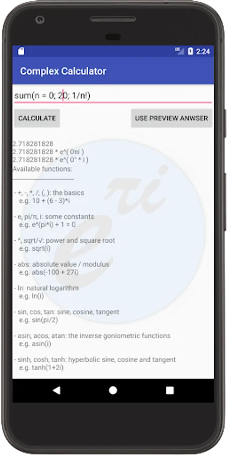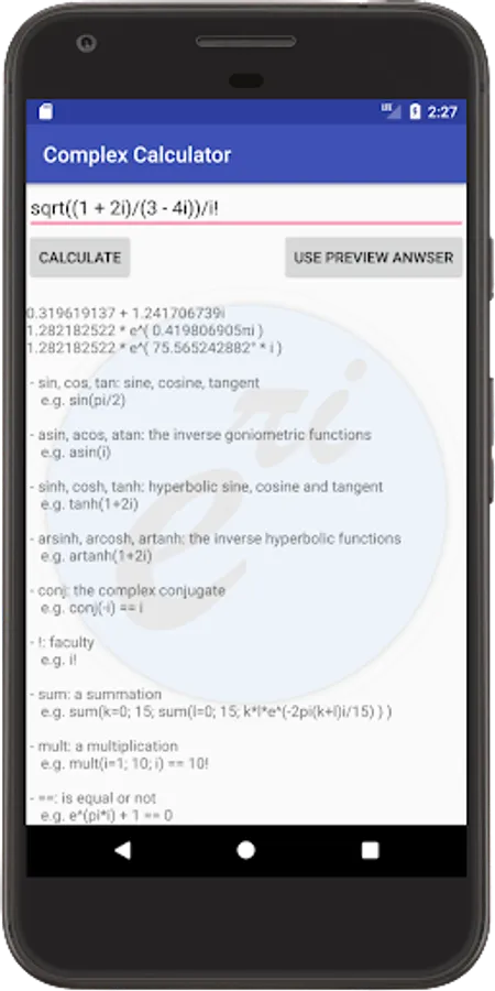 - Many functions included such as sin and ln. And all work perfect with complex arguments too.