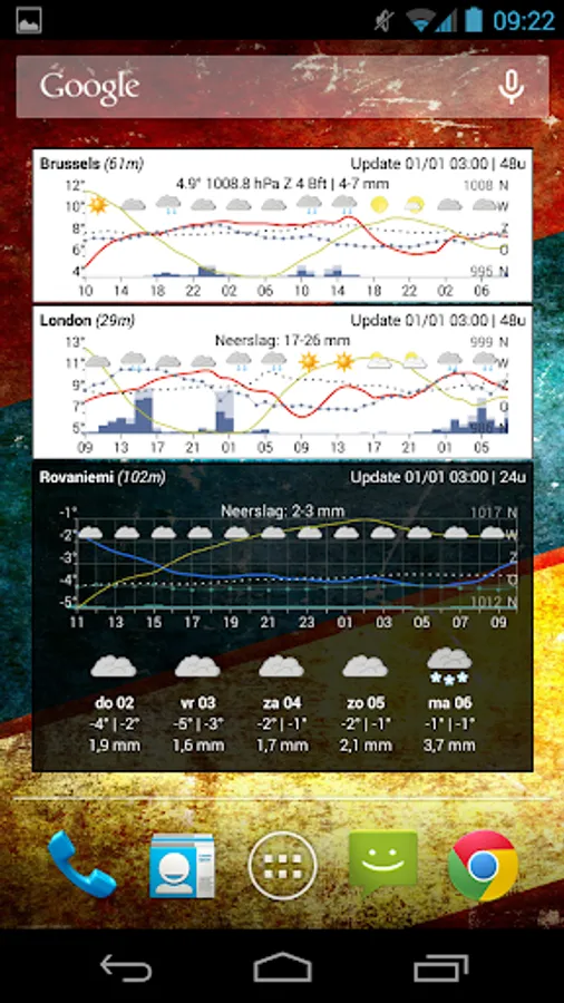 The main focus of the app consists in showing the meteogram on a small home screen widget (e.g. a 4X1 widget). Even while the widget does not occupy that much space on the home screen, it still manages showing the forecast in a clear way. Simply add a widget on your home screen, specify your location (or let the widget automatically determine your location) and the weather forecast appears on your home screen.