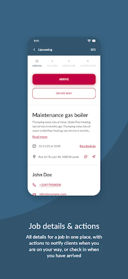 Jaimy Pro mobile application gives the technicians on the field all the tools they need to do the best job. Inform the client about the time you arrive, take the necessary pictures, and collect the signature for each job. It simplifies the paperwork and unnecessary phone calls and gives you an easy way to capture the information your company - or insurance agency - needs to process the work done.