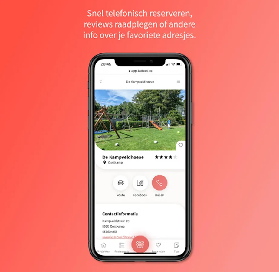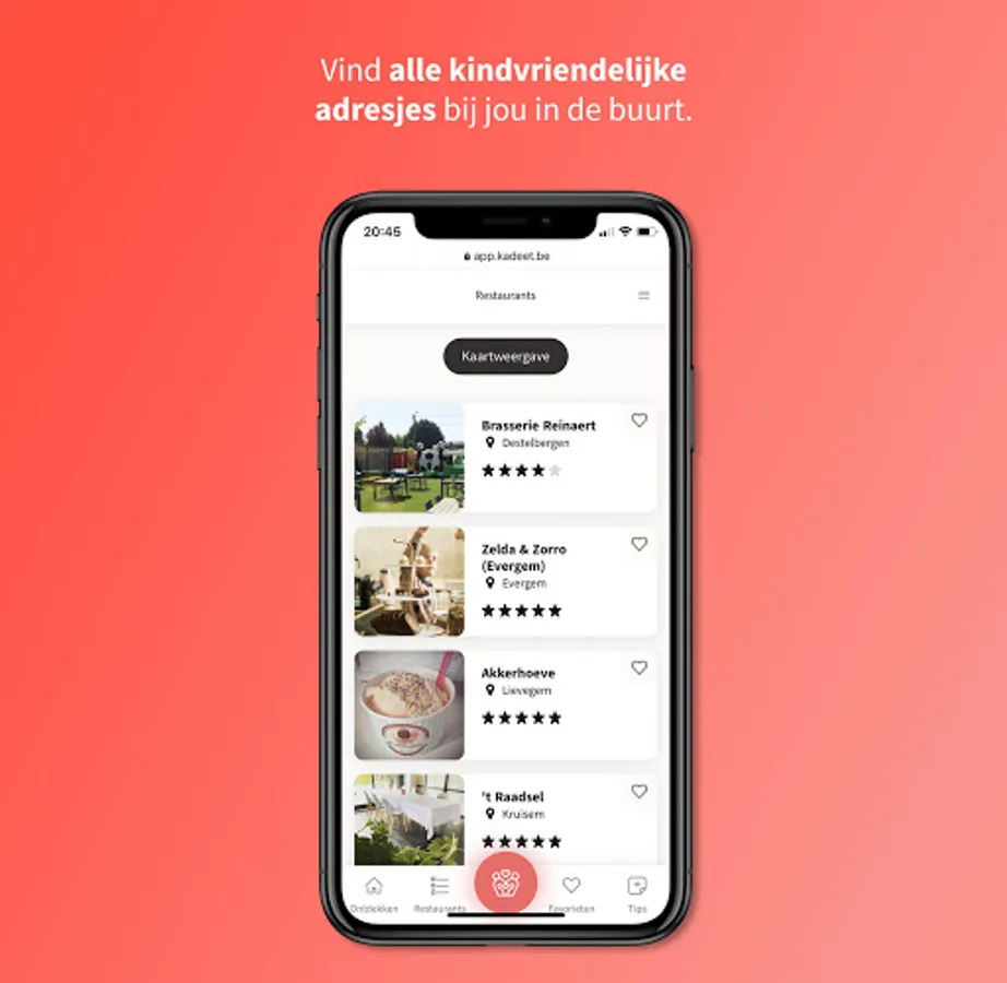 Kadeet is the child-friendly restaurant application for parents, families and grandparents. Feel like going to a restaurant with your offspring? In the Kadeet app you will find all the best child-friendly addresses in your area.