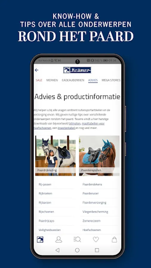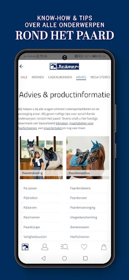 At Kramer Equestrian you will find a huge choice of riding clothing, riding boots and riding shoes, accessories, safety equipment, but also horse blankets, horse feed, saddle pads, leather goods and much more.