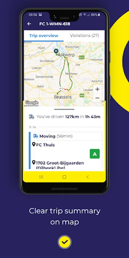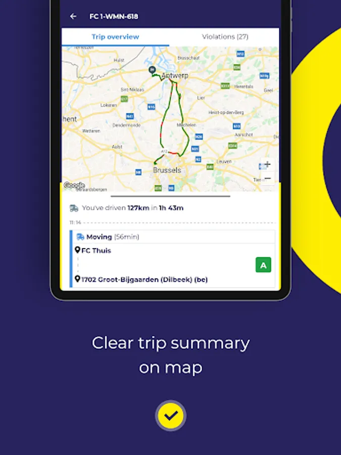 - A practical overview of the trips made (also to be consulted on the map), idling, G-forces, traffic offences, average and maximum speeds, ...