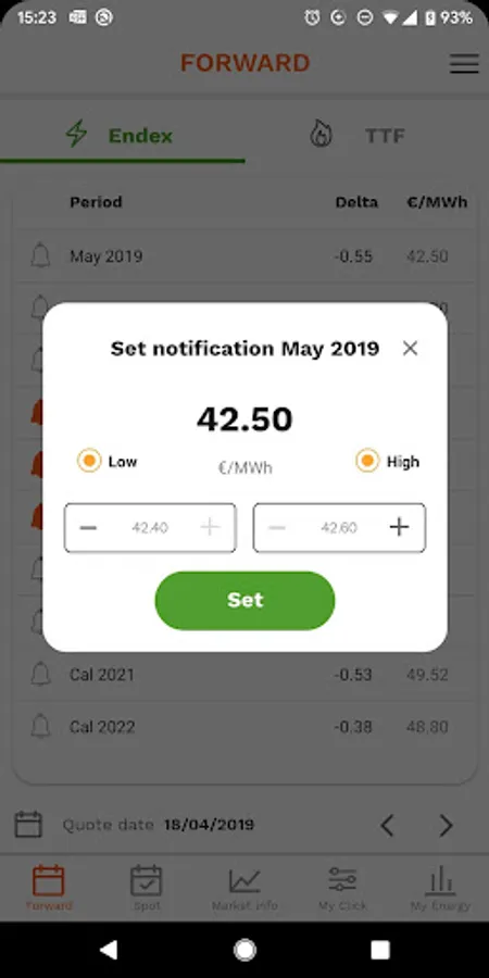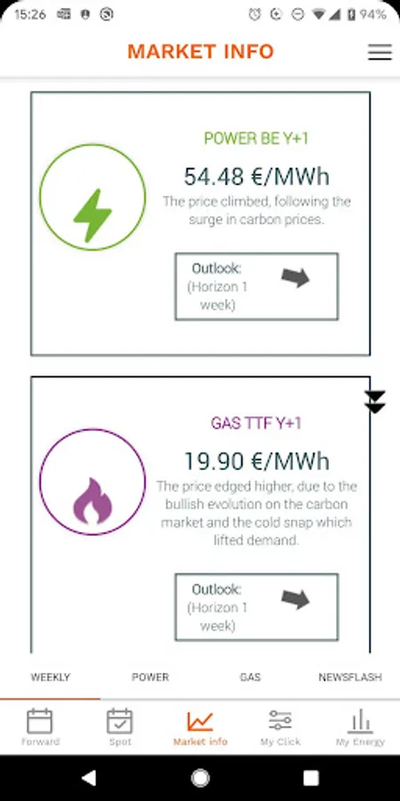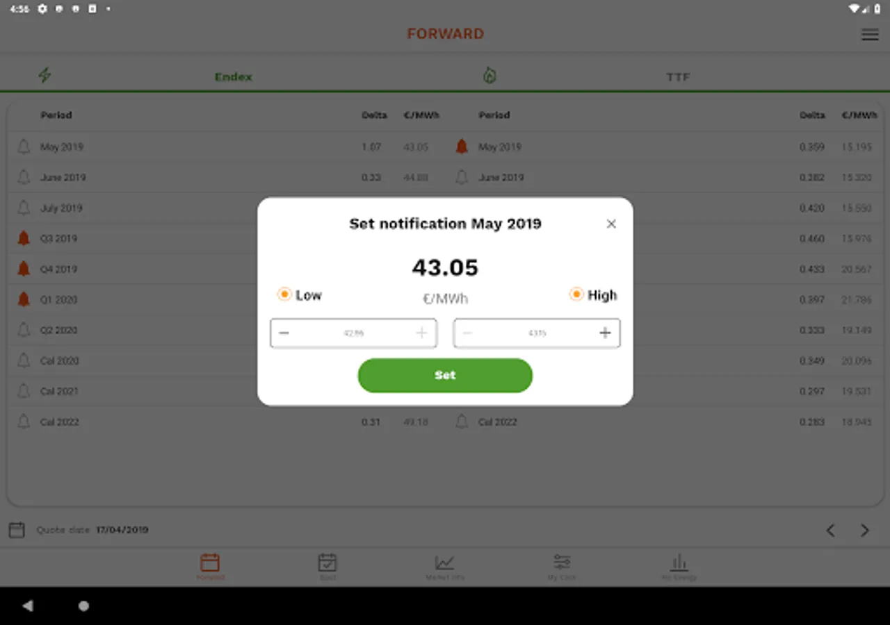 - Consult market forward prices and set alerts on thresholds when you would like to be informed by a push notification. This can be interesting to optimize the moment when you buy your energy